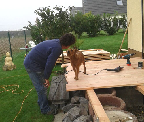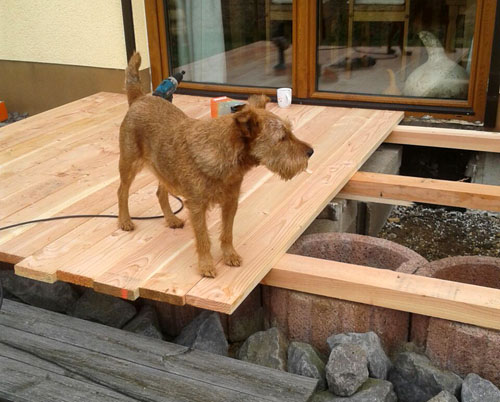 Akimba überwacht die Arbeiten an der neuen Holzterrasse.