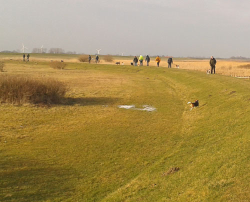 „großen Aufgebot“ an Menschen und Hunden zu einem Spaziergang an der Küste von Hooksiel.