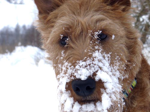 Und hier als „Winterirish“ mit dickem Pelz im Schnee