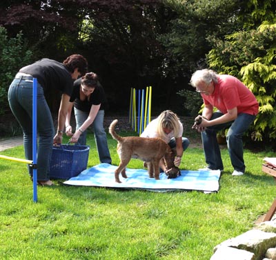 Die anwesenden zukünftigen Welpeneltern wurden gleich mit eingespannt,
