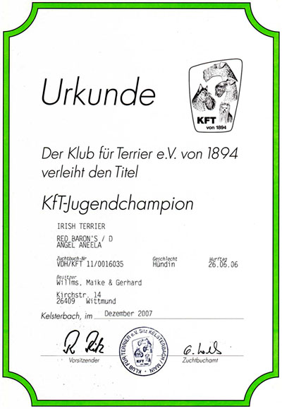 Im Dezember 2007 wurde Aneela mit dieser Urkunde des KfT der Titel KfT - Jugendchampion zuerkannt.