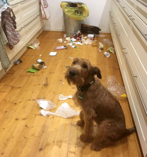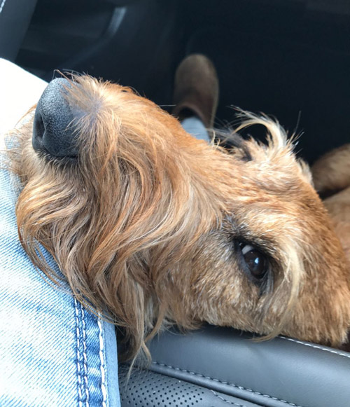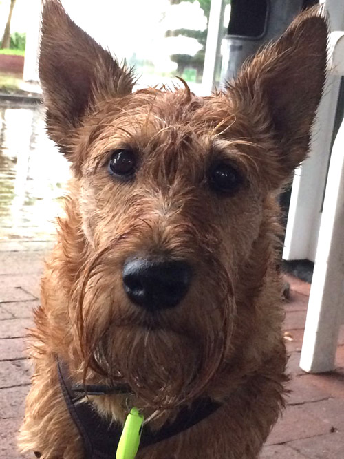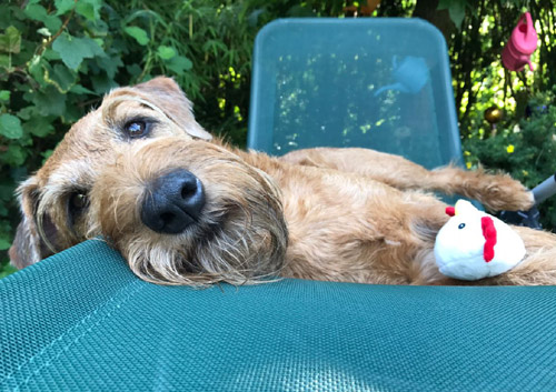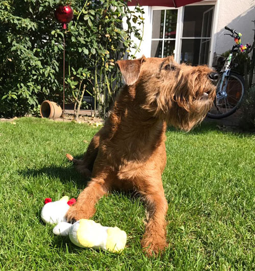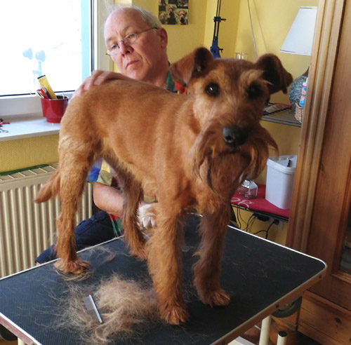 Ihrer Schwester Chaya wird für das Irish Terrier Treffen in Heek hübsch gemacht.