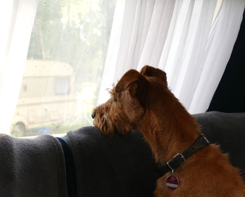 Im Wohnwagen: Frauchen ist weg gefahren. Sie wartet ungeduldig auf meine Rückkehr.
