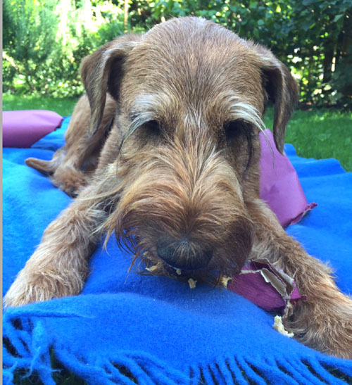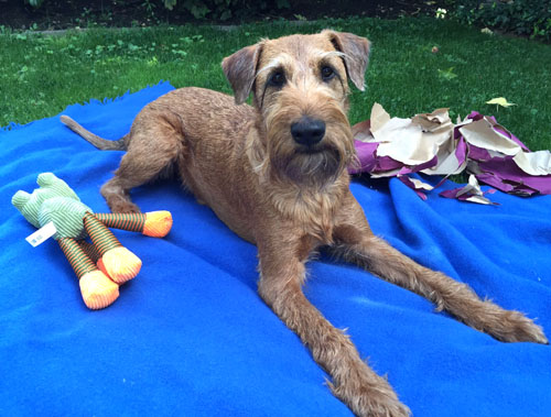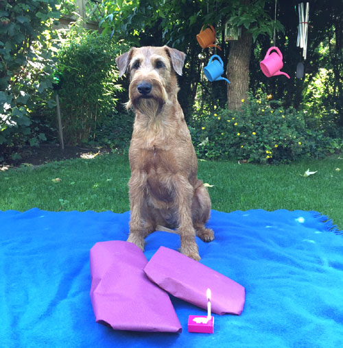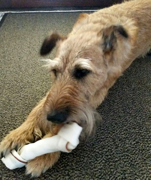 Carlo hat einen dicken Kauknochen zum Geburtstag bekommen.