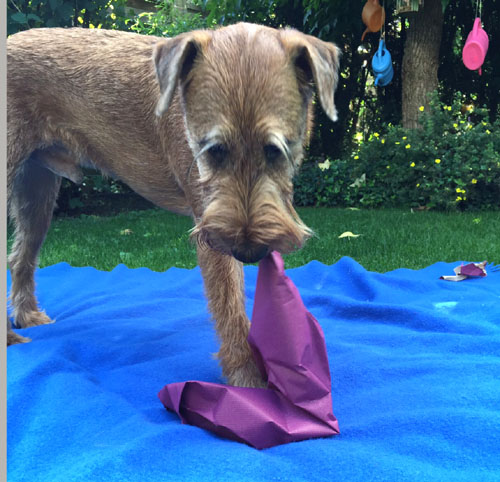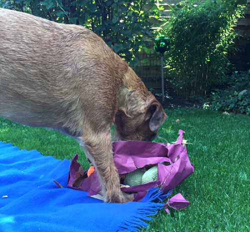 Bildgeschichte: Chutney packt sein Geburtstagsgeschenk aus.